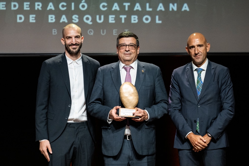 Membres de la Federació Catalana de Basquetbol i la Fundació del Bàsquet Català amb el guardó / Foto: Pere Puntí (MD)